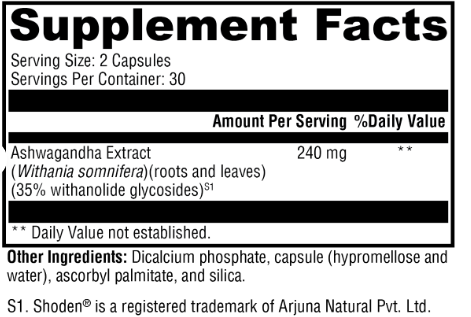 Ashwagandha 35 features Shoden®, a purified extract of the leaves and roots of the ashwagandha plant that has been standardized to an industry-leading concentration of 35% withanolide glycosides. Shoden has been researched for its effects in helping the body adapt to physical and mental stressors and supporting the restoration of sleep quality.