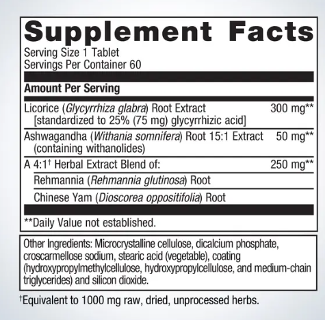 Licorice (Glycyrrhiza glabra) Root Extract [standardized to 25% (75 mg) glycyrrhizic acid] 300 mg * Ashwagandha (Withania somnifera) Root 15:1 Extract (containing withanolides) 50 mg * A 4:1† Herbal Extract Blend of: 250 mg * Rehmannia (Rehmannia glutinosa Root) Chinese Yam (Dioscorea oppositifolia) Root