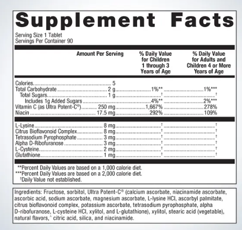 Vitamin C (as Ultra Potent-C® ) 250 mg 1,667% Niacin 17.5 mg 292% L-Lysine 8 mg † Citrus Bioflavonoid Complex 8 mg † Tetrasodium Pyrophosphate 3 mg † Alpha D-Ribofuranose 3 mg † L-Cysteine 2 mg † Glutathione 1 mg † % Daily Value for Children 4 or more Years of Age Calories 5 Total Carbohydrate 2 g 1%*** Total Sugars 1 g † Includes 1g Added Sugars 2%*** Vitamin C (as Ultra Potent-C® ) 250 mg 278% Niacin 17.5 mg 109% L-Lysine 8 mg † Citrus Bioflavonoid Complex 8 mg † Tetrasodium Pyrophosphate 3 mg † Alpha D-Ribofuranose 3 mg † L-Cysteine 2 mg † Glutathione 1 mg † I