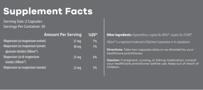 Other Ingredients : Hypromellose, organic Nu-MAG®, organic Nu-FLOW®. If you are pregnant, nursing, or taking medication, consult your healthcare practitioner before use. Keep out of reach of children. Albion® is a registered trademark of Balchem Corporation or its subsidiaries.