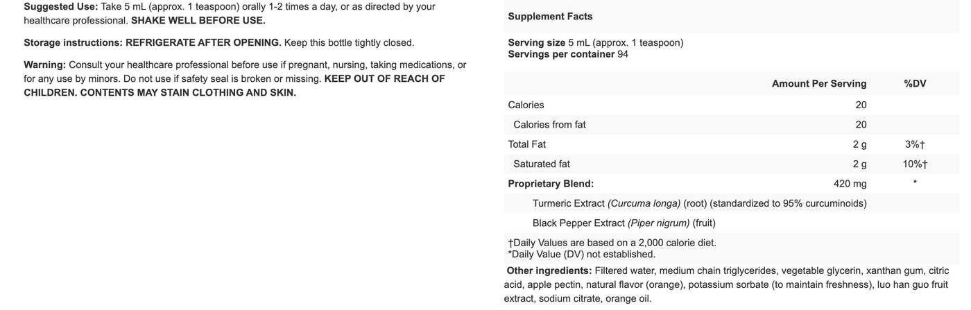 Other ingredients: Filtered water, medium chain triglycerides, vegetable glycerin, xanthan gum, citric acid, apple pectin, natural flavor (orange), potassium sorbate (to maintain freshness), luo han guo fruit extract, sodium citrate, orange oil.